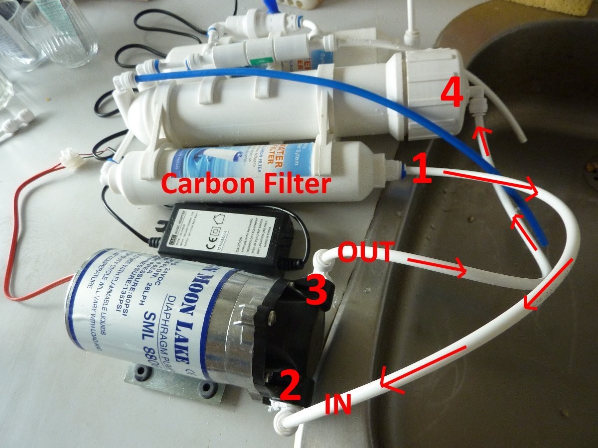 Pumpen indsættes før membranen. Husk at flow restrictoren/begrænseren skal være mindst 420ml/minut. Jeg anbefaler en 550ml begrænser, se mine tests ved de forsk. membraner. Alt andet lige: membranen holder længere, jo større begrænser/restrictor.