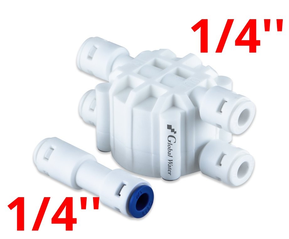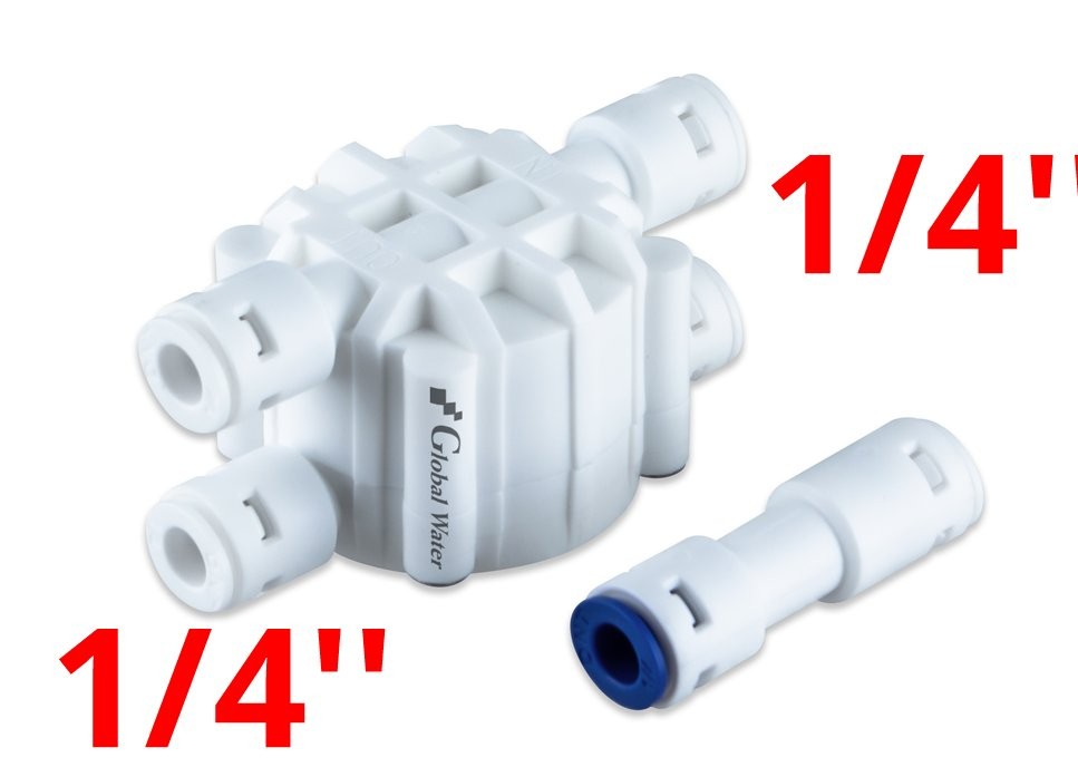 The new check valve should be connected in accordance with the water flow direction (indicated by the arrow on the valve) just behind the elbow that drains clean water from the membrane. The four-way valve should be connected according to the drawing below: