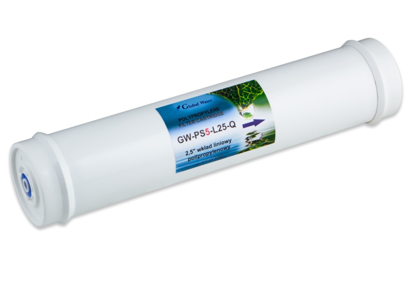 In-line sediment filter cartridge with a diameter of 2.5 inches. Precision: 5 microns.