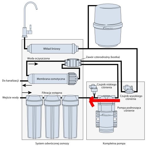 Pumpen indsættes før membranen. Husk at flow restrictoren/begrænseren skal helst være 550ml/minut. Begrænseren er IKKE med i prisen. Jeg anbefaler en 550ml begrænser. Alt andet lige: membranen holder længere, jo større begrænser/restrictor.