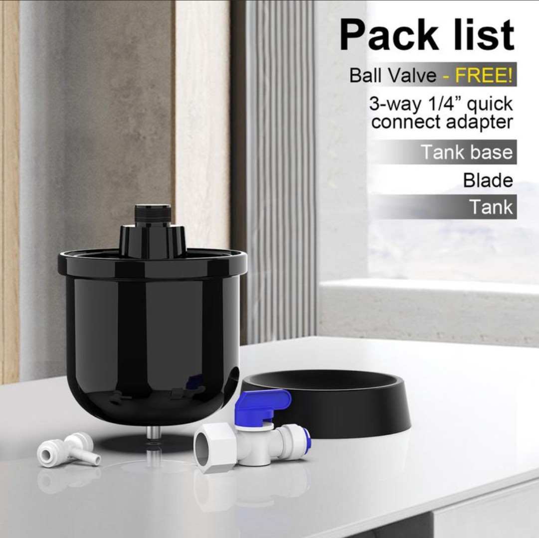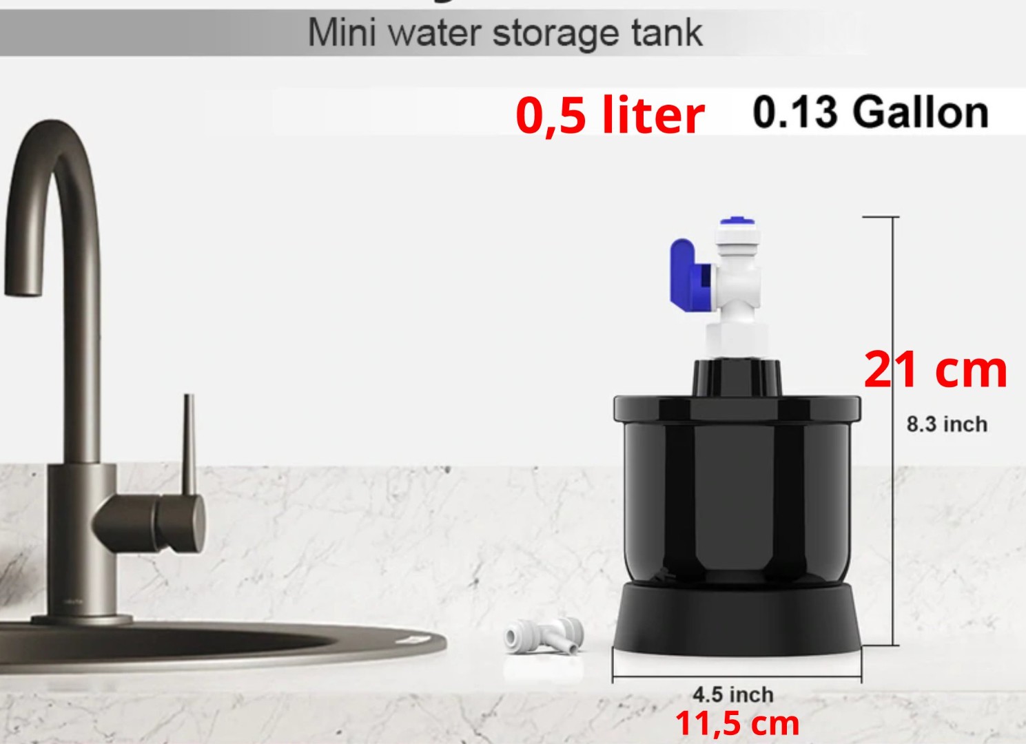 - Super nem at installere. Med en brugermanual er minitanken nem at installere med et 1/4" quick connect design. Skær blot din udløbsvandledning af RO-systemet af og indsæt tanken mellem snittet. Pakken inkluderer en 3-vejs hurtig fitting, en kugleventil, en tank og en tankbase. Alt nødvendigt til installation er inkluderet.